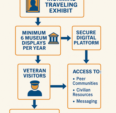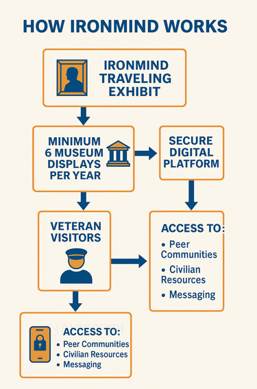 At the centre stands the IronMind pillar—a secure digital platform offering private access to peer communities, veteran organizations, and wellness supports through encrypted chat channels veterans already use in daily life. Its purpose is simple: reduce isolation, strengthen community, and make connection easy to access without navigating complicated systems.
