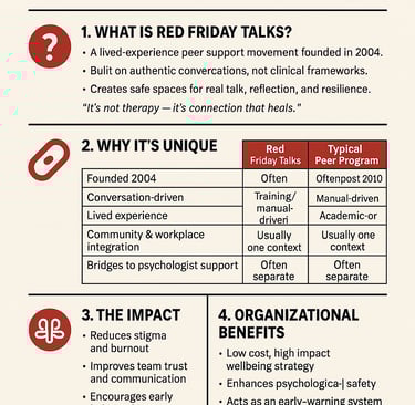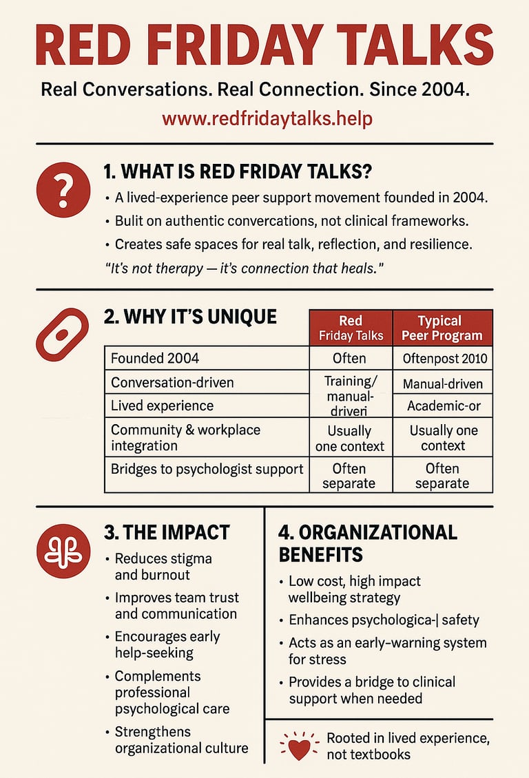 Dimension Red Friday Talks Typical Peer Support Model Founded 2004 Often post-2010 Foundation Lived experience & storytelling Training-based peer roles Structure Conversational, organic Procedural or therapeutic Audience Community and organizations Usually one or the other Goal Connection, awareness, guidance Recovery, performance, or compliance Outcome Cultural change & psychological safety Individual recovery or academic improvement